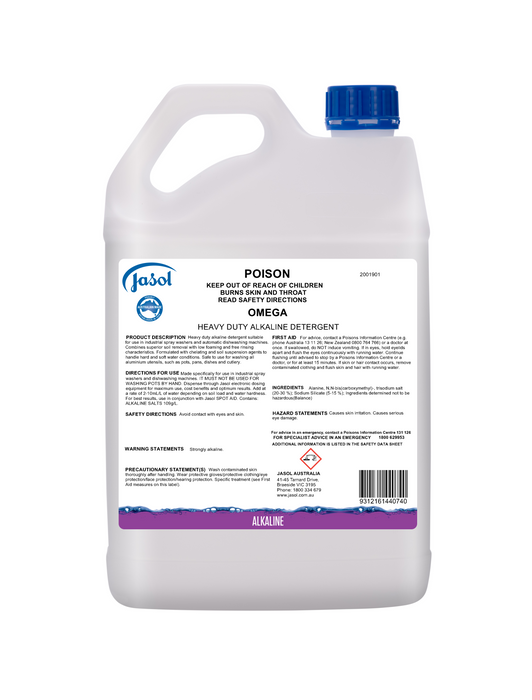 Formulated with high concentration of alkaline salts for economic use rates, Omega will allow spray wash cabinets, dishwashers and flight machine to operate longer due to its chelating and sequestering ability. Safe to use on all Aluminium utensils. AQIS Approval. KOSHER Approval. HALAL Approval.