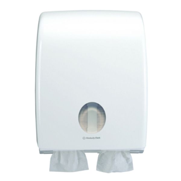 The KIMBERLY-CLARK PROFESSIONAL® AQUARIUS® Twin toilet tissue dispenser with single sheet dispensing ensures the user touches only the toilet tissue they use promoting good hygiene in the washroom as well as limiting waste and overuse. And touch-free dispensing enables the user to retrieve the toilet tissue without touching the dispenser, further promoting good hygiene practices. This dispenser can hold twice the quantity of toilet tissue (vs AQUARIUS® Interleaved toilet tissue dispenser (69460) making it a high capacity dispensing solution for busy washrooms. Featuring a contemporary design in white, high-gloss ABS plastic, with smooth and continuous surfaces making it easy to clean whilst also blending seamlessly into your workplace.